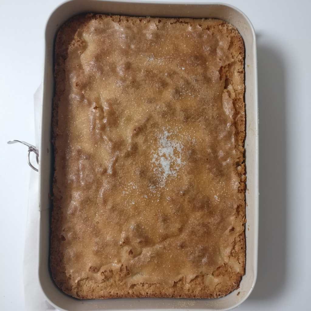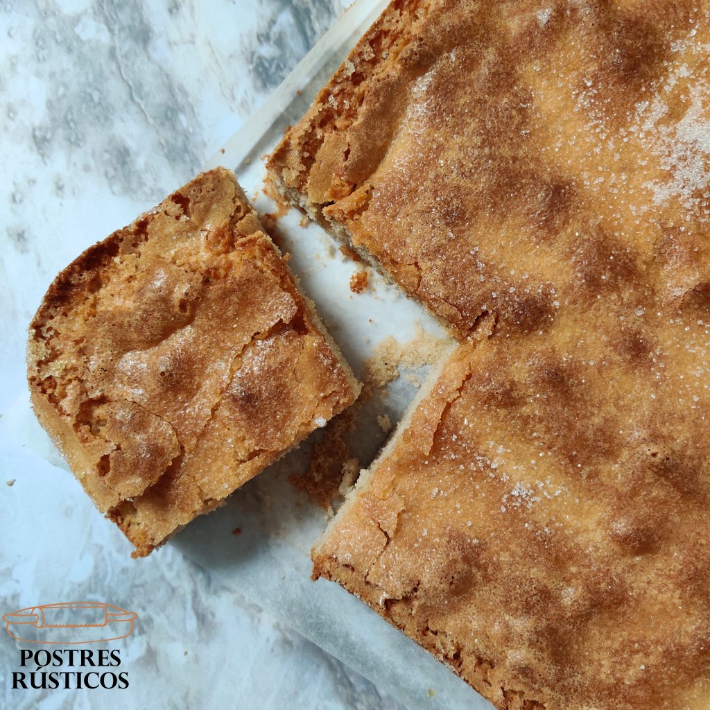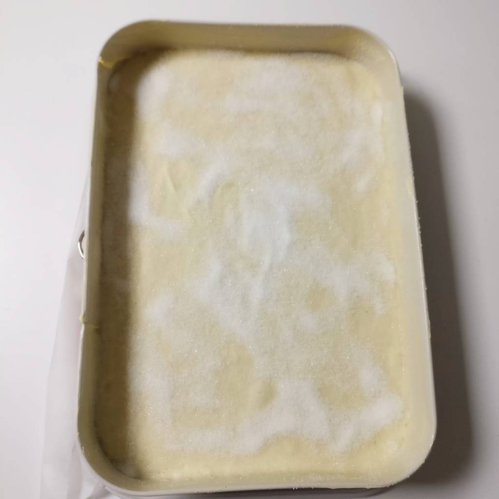 6- Vertemos la masa en un molde rectangular desmontable, forrado de papel vegetal, y untamos de mantequilla los laterales del molde. Espolvoreamos la superficie de la bica con bastante azúcar.